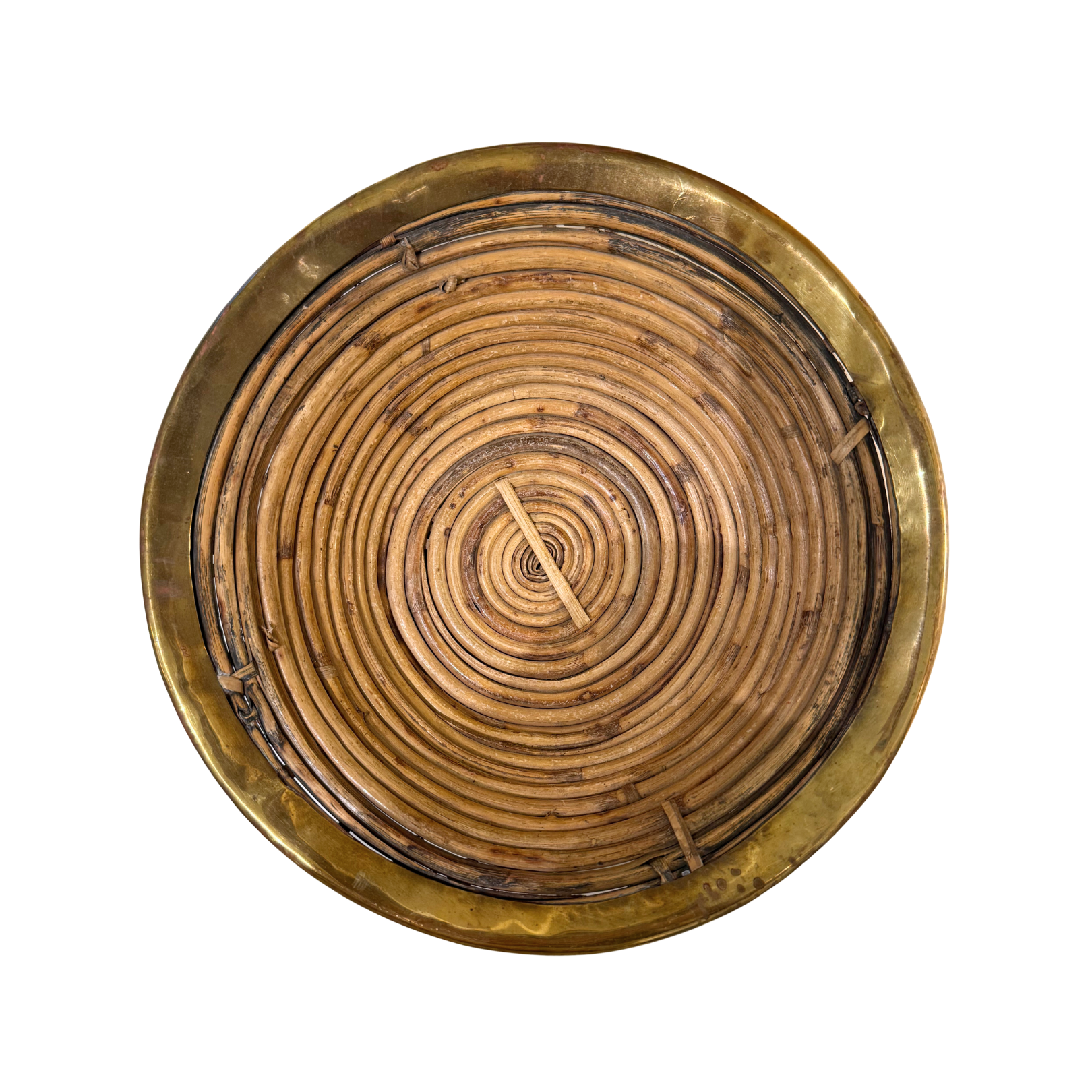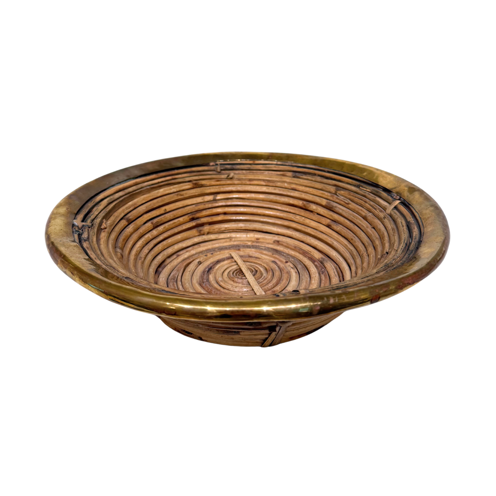 This mid-century modern creation, crafted in Italy and inspired by the style of Gabriella Crespi, is a striking combination of rattan and brass. Its handwoven bottom is adorned with a gleaming brass trim, making it ideal as an eye-catching centerpiece for any kitchen, living room, or dining room. Perfect for storing and displaying a variety of items, this large bowl or basket will add a touch of chic, mid-century flair to any space.