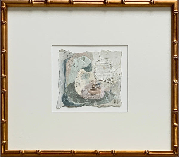 Details: Acrylic, oil, ink, pastel, linen on watercolor paper; gold wood bamboo frame with glass front.