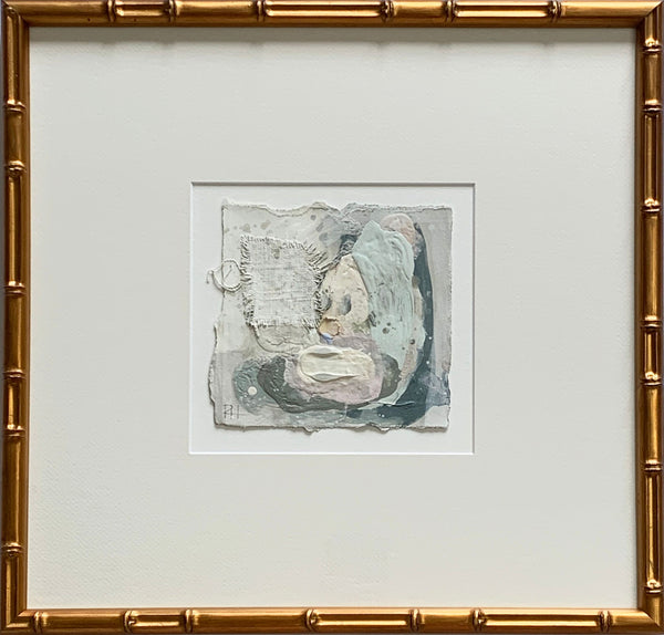 Details: Acrylic, oil, ink, pastel, linen on watercolor paper; gold wood bamboo frame with glass front.