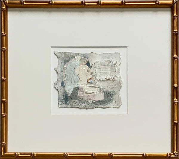 Details: Acrylic, oil, ink, pastel, linen on watercolor paper; gold wood bamboo frame with glass front.