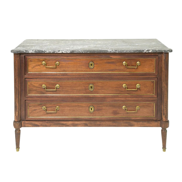 This antique Louis XVI style commode features elegant lines, brass hardware, and a richly veined grey marble top. Its timeless design and refined craftsmanship make it a striking statement piece with both beauty and utility.