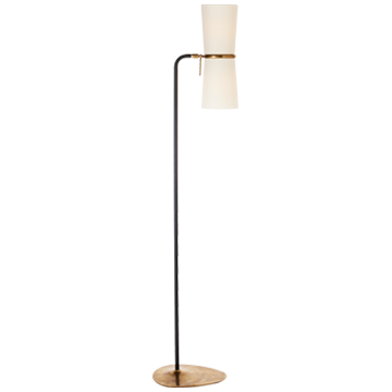 The Clarkson Floor Lamp features a black and hand-rubbed antique brass body and a tapered linen shade.