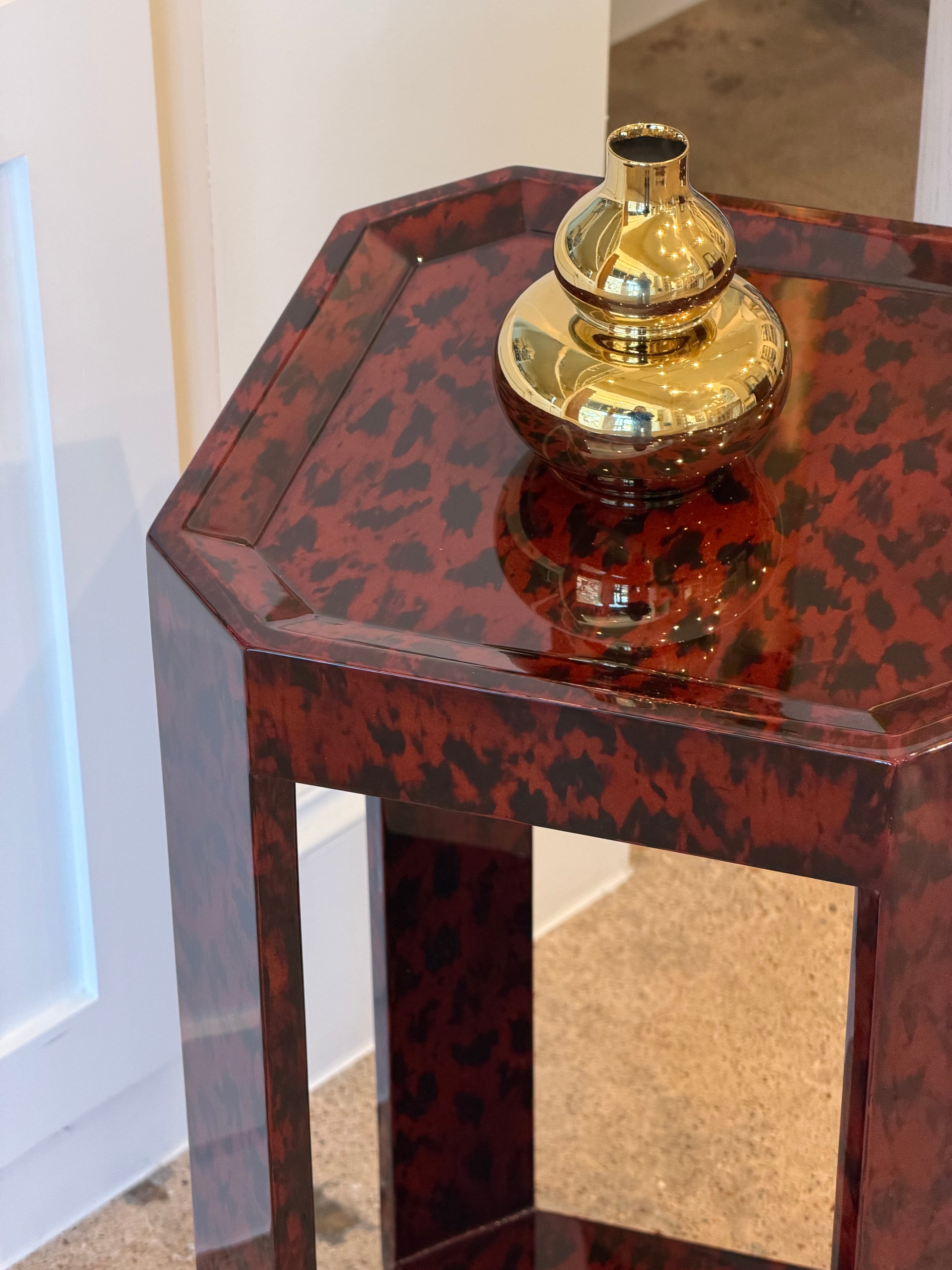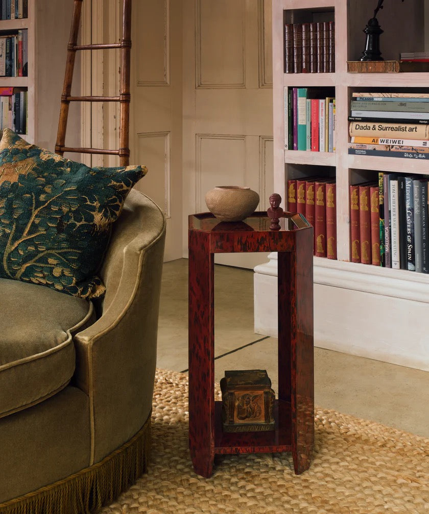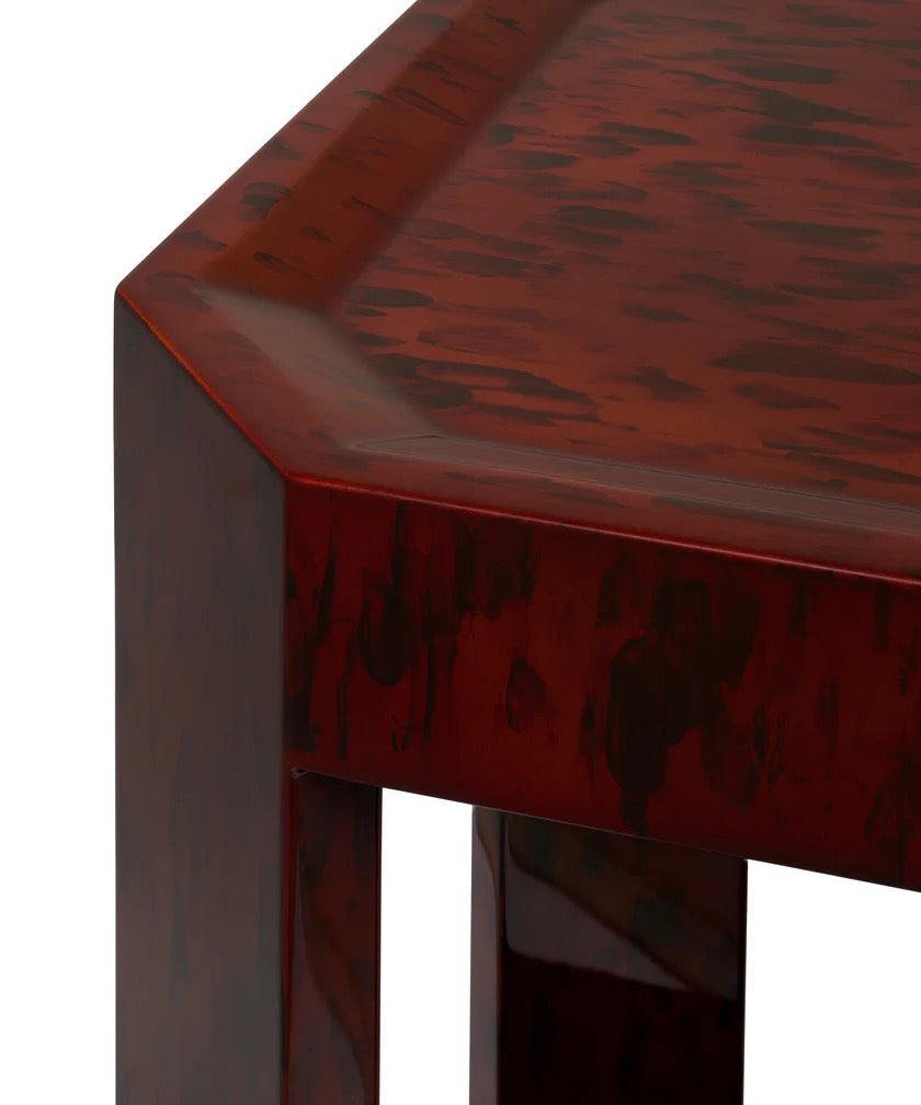 An elegant and refined table with an inset geometric top and lower shelf, available in a range of two-tone colourways. The Felix Drinks Table gently nods to the glamorous golden age of twentieth century Art Deco lacquer and is ideal beside an armchair or between a pair of chairs. Handmade in traditional Son Mai Lacquer.