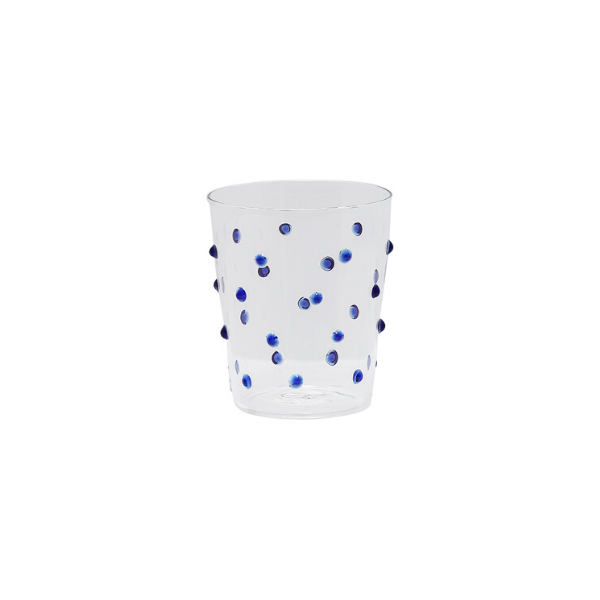 About : It's a party! These hand blown cocktail glasses are sure to get any party started. They are delicate, sturdy, and each one is adorned with blue glass dots all around them. Note: Dishwasher Safe
