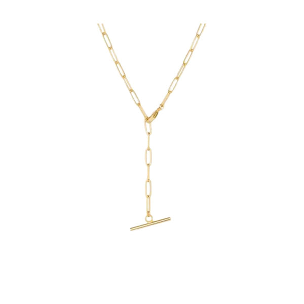 About: Take the paperclip trend to the next level with this luxe lariat style. Featuring a minimalist bar design, you can clasp it along any link for a customizable look. Wear it short or long, with a classic white tee or mixed into your necklace stack. 14k gold plated 3.4mm Finn elongated lariat necklace with toggle charm and adjustable lobster clasp closure.