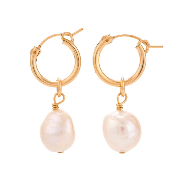This hoop collection is the perfect everyday wear. Over time you can collect charms or stones to change out on the hoops. The Beck is a 14k gold fill hoop with white fresh water pearl.