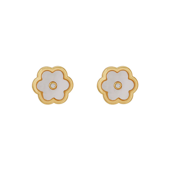 About: Our bestselling Garden Studs now available in a petite size. 14k gold dipped stud with mother of pearl garden flower stone with cz center.