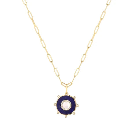 Item: The latest charm from our Resort Collection, this piece showcases our two favorite gemstones: luminous mother of pearl with rich lapis. Comes with paper clip necklace. This piece harnesses the power of the sunshine and brings a bit of wanderlust along with it. 14K Gold.