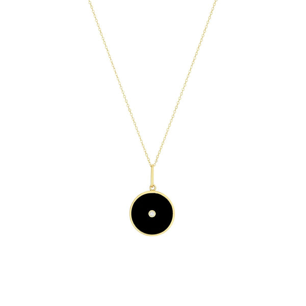 About : 14k gold plated balia disc charm with enamel x center cubic zirconia on 18" cable chain with 2" extender.