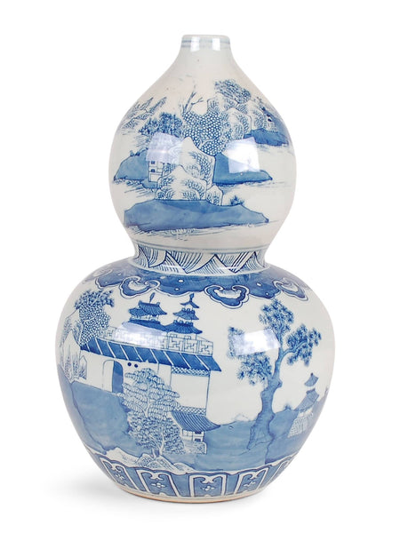 Reproduction porcelain double gourd vase with hand-painted blue and white Canton design.