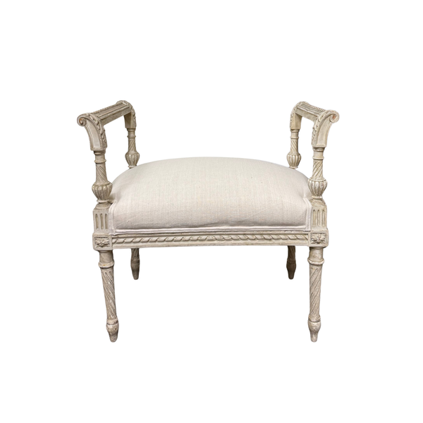 About: Bring a touch of French-inspired opulence to your home with this beautifully crafted Louis XVI bench, designed to elevate your decor with its refined aesthetics and superb craftsmanship. Elegantly upholstered in Belgian linen for a touch of sophistication and luxury. Its solid white oak legs are meticulously carved in the iconic Louis XVI style, adding a classic and timeless allure to any space. This bench seamlessly blends traditional elegance with modern comfort, making it a perfect addition to your living room, bedroom, or entryway.