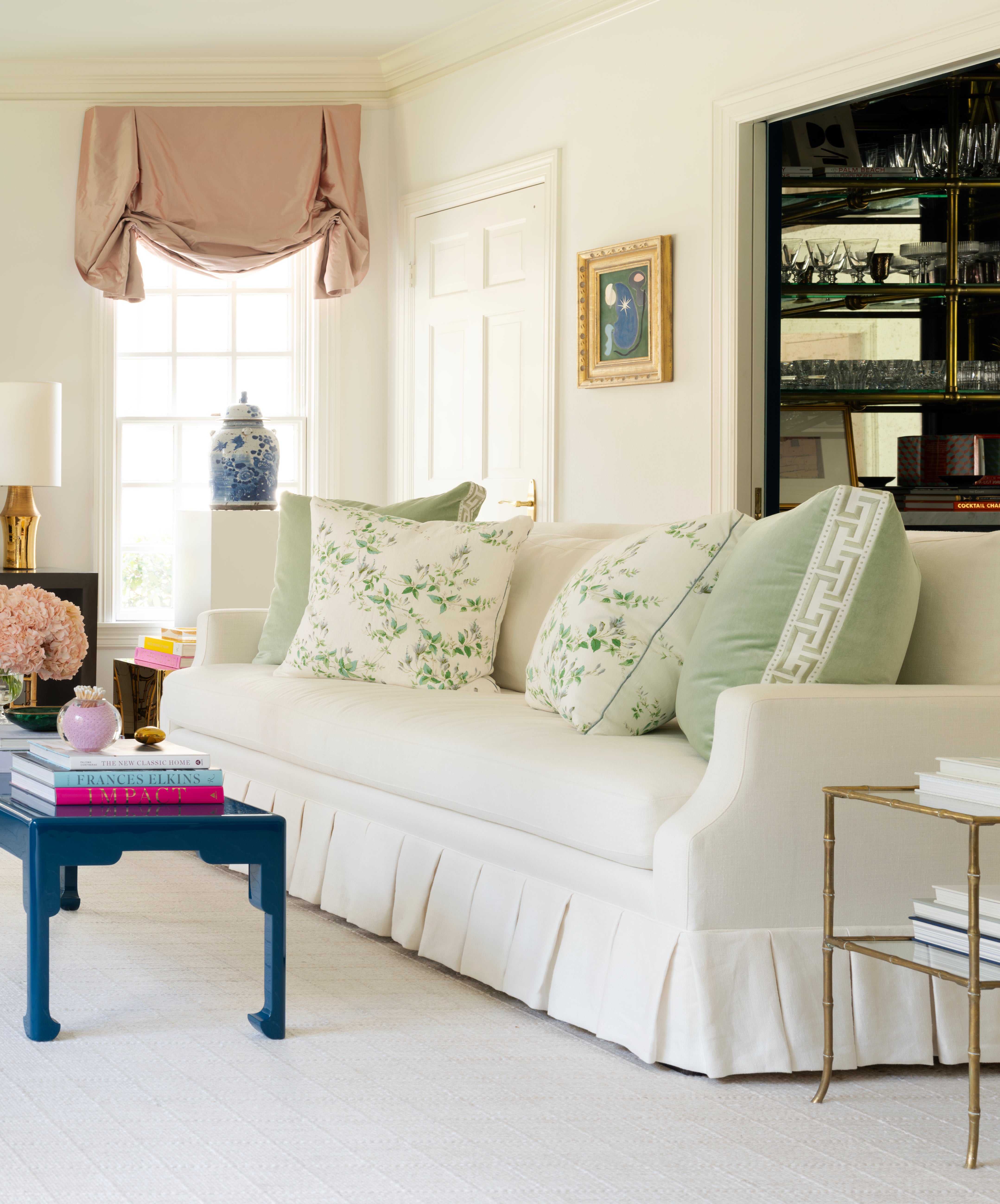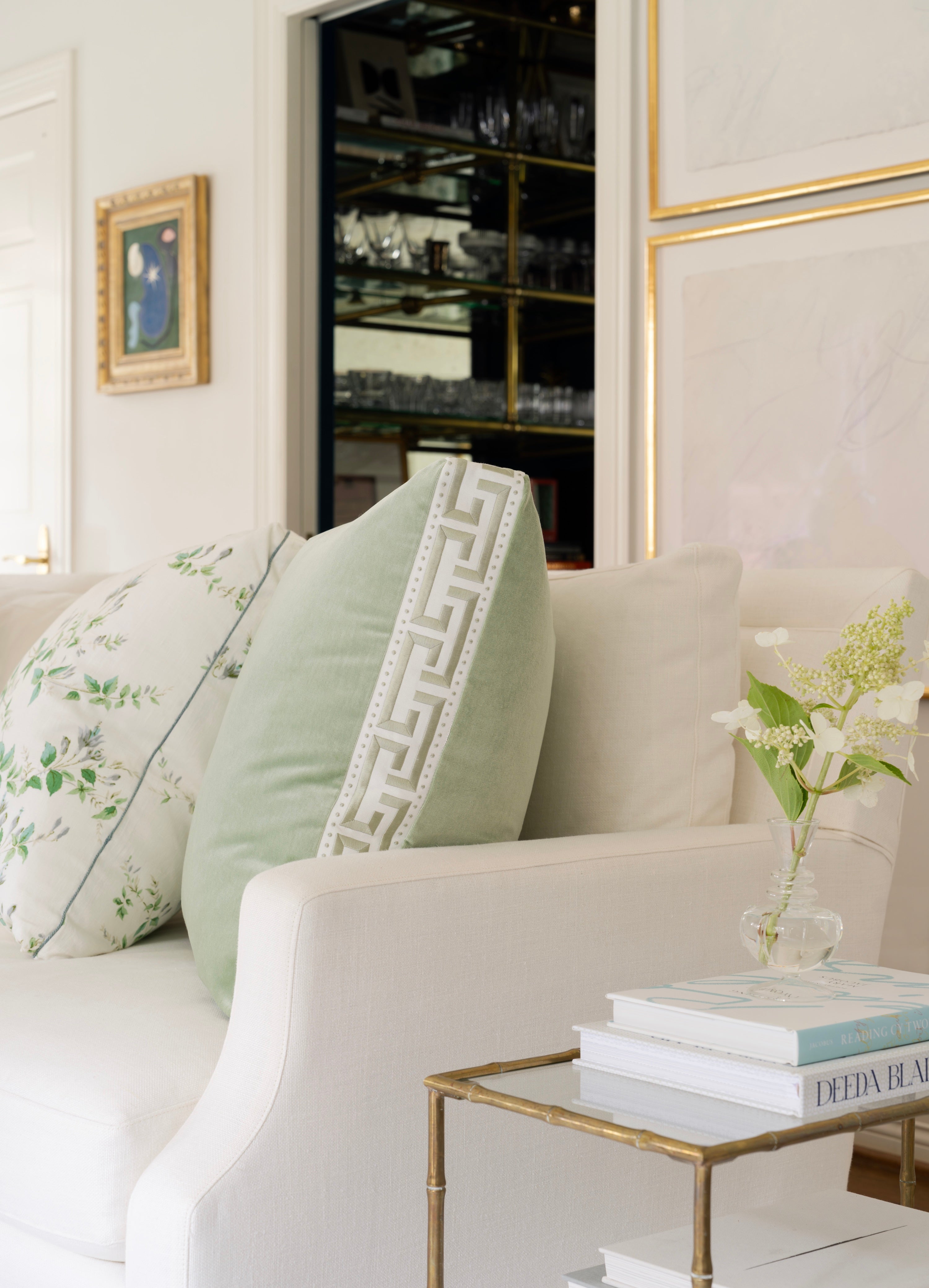 Item: Custom-made pillows with Turkish corners, crafted in Colefax and Fowler Fuchsia Silver/Leaf fabric and finished with coordinating cord trim. Sold as a pair.