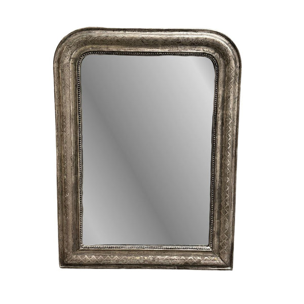 An elegant 19th-Century French Louis Philippe silver leaf giltwood mirror. This fine mirror has a lovely engraved geometric design in a beautiful silver patina and retains the original mirror glass and wood backing. It's a wonderful classic design, perfect for any living space.